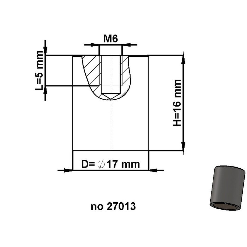 Cylindrical pot magnet dia. 17 x height 16 mm with inner screw thread M6. screw thread length 5 mm