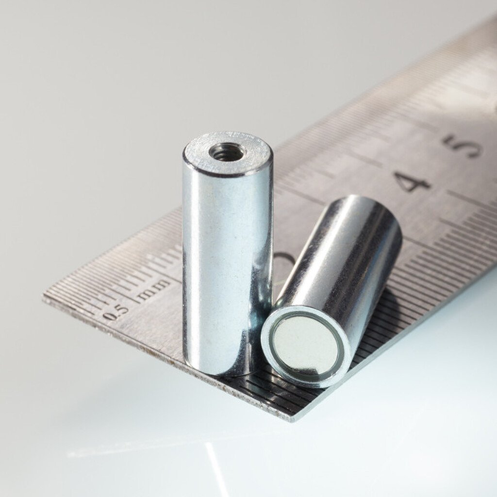 Cylindrical pot magnet dia. 8 x height 20 mm with inner screw thread M3. screw thread length 5 mm