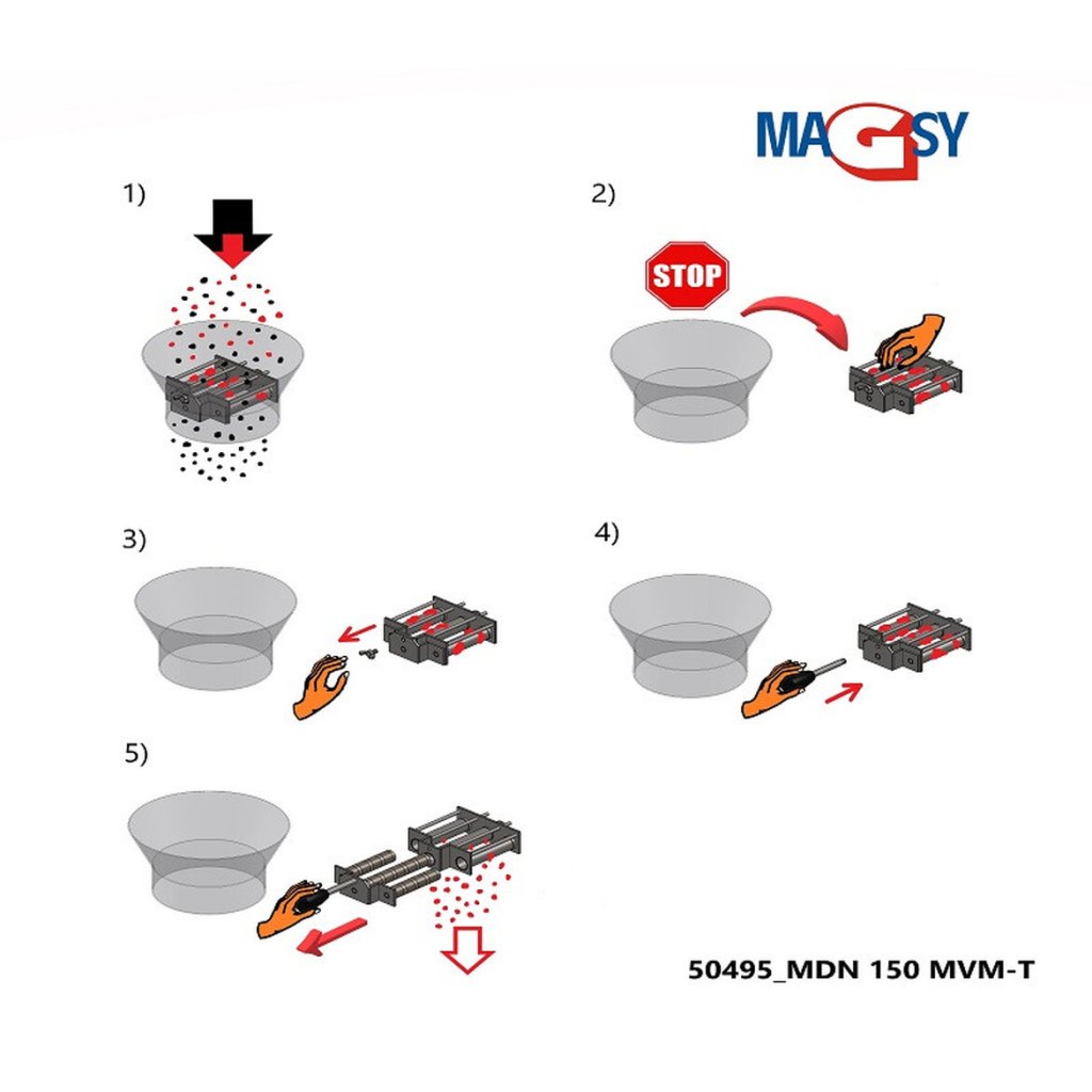 The hopper magnet is designed to capture as much ferromagnetic metallic contaminants as possible. However, it all depends on the amount of these ferromagnetic impurities present in your material. It is not possible to guarantee the capture of all ferromagnetic impurities. The specific technology and capacities must always be considered. If necessary, other types of magnetic separation/magnetic grids/magnets should be preassigned or added to the hopper. Please do not rely solely on this one hopper magnet. If you are unsure, do not use this type of hopper magnet and contact our magnetic separation experts at any time.