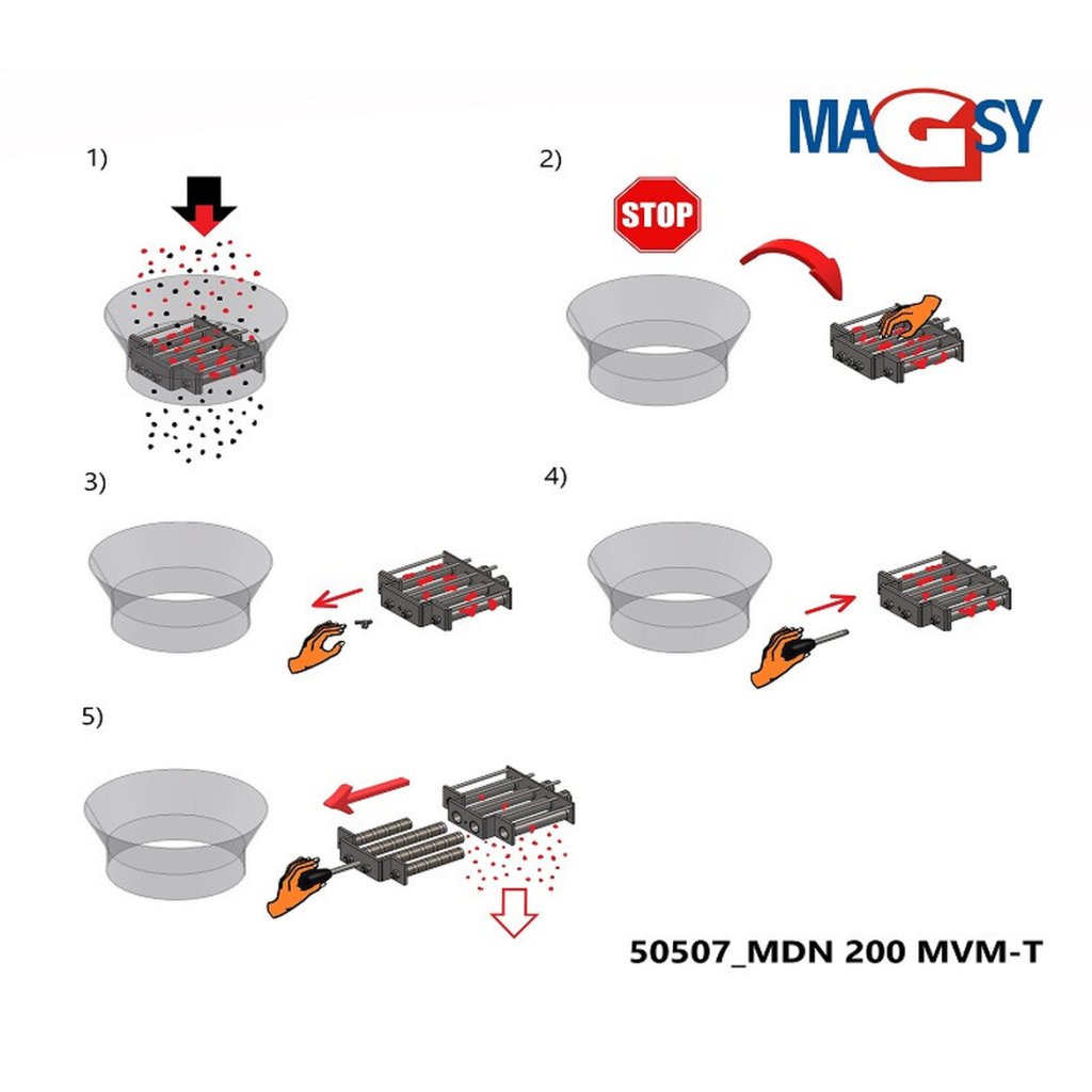 The hopper magnet is not intended for the magnetic separation of non-magnetic non-ferromagnetic metals nor for the magnetic separation of parts or parts containing ferromagnetic metals (e.g. plastic parts with pressed-in metal parts, crushed window frames with leftover metal strips, wooden pellets with pressed-in fine wires...). In case you need to separate such ferromagnetic impurities, do not use this magnet in the hopper and contact our magnetic separation experts who will advise you which other magnetic separator to use or which type to add to your separation set-up.