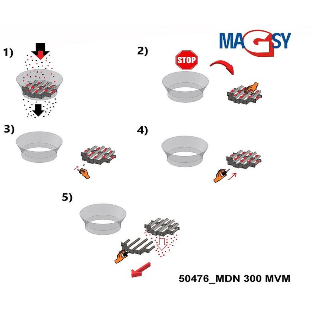 This magnet picks up (separates) metallic ferromagnetic particles from 1 µm and smaller (characteristically ferromagnetic, immeasurable, magnetic dust) up to a size of 3 mm (3x3x3 mm), which is the maximum fraction (size) of material that can fall on the magnet into the hopper and that can be poured over it. In rare cases, this magnet can also trap larger metal objects up to 5 mm (5x5x5 mm) in the hopper. However, it is assumed that these impurities will occur randomly up to a maximum of 1% of the total hourly capacity of the material to be screened (it is assumed that the magnetic grate is cleaned of ferromagnetic impurities regularly, this is not meant to imply that the entire 1% of larger, ferromagnetic impurities may remain on the hopper magnet for the entire time the hourly capacity of the material to be screened is being screened). The content of these larger ferromagnetic impurities must not be higher. If the presence of these larger ferromagnetic impurities in your material is higher, do not use this hopper magnet and contact our sales and technical department for expert advice.