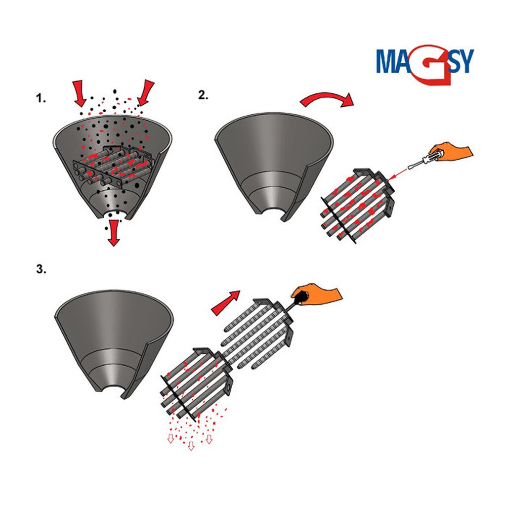The hopper magnet is used as a pre-stage to protect the technology so that metal ferromagnetic impurities do not get into the equipment that they could damage, such as mill knives, crushers, regranulation and granulation line nozzles, injection molding nozzles, extrusion benches, press benches, scrapping equipment, fine screens, ceramic press benches, glass presses, etc. Wherever material is collected in a hopper prior to technology. It can also be used to purify the mixture to the highest possible cleanliness, where the grate is placed at the end of the production process just before packaging, dispatching, so that there is no more contamination with metallic ferromagnetic material during further operations in the production plant (for example, during manual packaging of products through auxiliary hoppers). In this case, it is expected that the purified material will be immediately enclosed in resealable containers or in other resealable containers. Due to the perfectly designed magnetic circuit and the sieving labyrinth created by the expanding circular steel, a high capture of ferromagnetic impurities is achieved (please read in detail below the description of what ferromagnetic metallic impurities can be captured by this magnetic grid).
