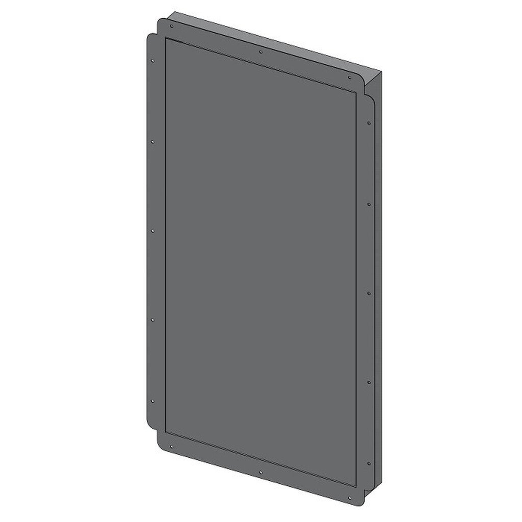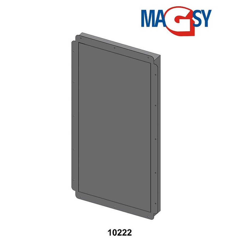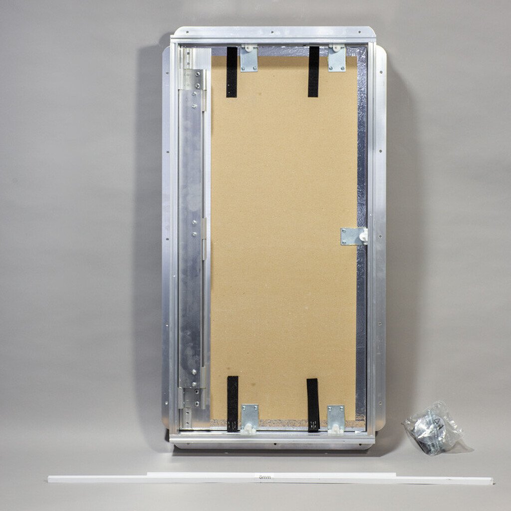 The inspection door under facing is used to cover inspection holes in walls where final finishing with glued ceramic facing is required. They are installed in locations where it is necessary to have access to revisions or installations. They are designed to be installed in plasterboard systems or in solid masonry (YTONG system, etc.). The outer frame is mounted in the construction hole by means of the appropriate fasteners and opening plasterboard, attached to its aluminium hinges, allowing access to the wiring behind building structures. After being fitted, the door is lined with ceramic tiles.