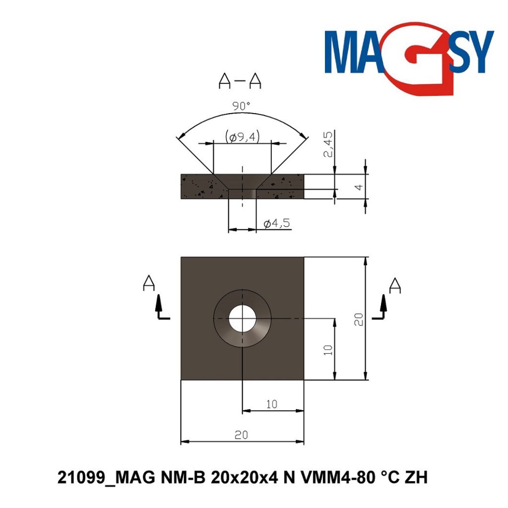 Neodymium magnet prism with a hole for screws with embedded heads 20 x 20 x 4 N 80 °C, VMM4-N35