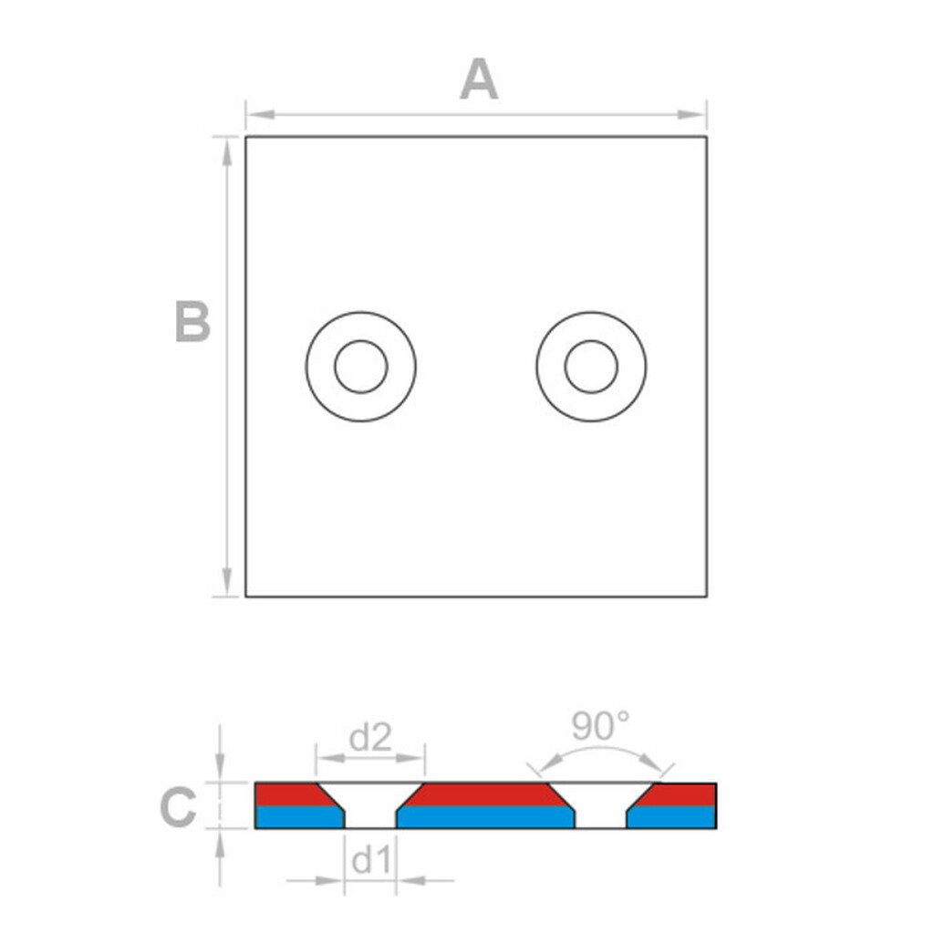 | Magnet shape: | Blocks with two screw holes, magnetized perpendicularly to the surface |